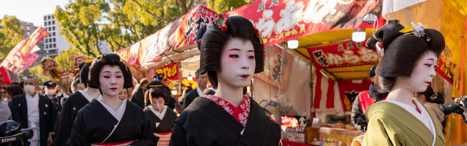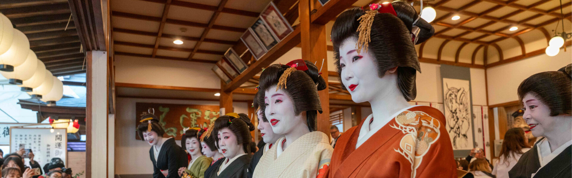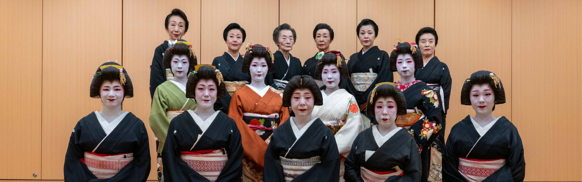 伝統伎芸とおもてなしの担い手といえる芸妓は、一流のお師匠様方から舞踊、唄、三味線、太鼓などのお稽古を重ね、料亭の女将さんや先輩芸妓の姉さん方から、礼儀作法やおもてなしする術など学びながら日々、精進に努めています。