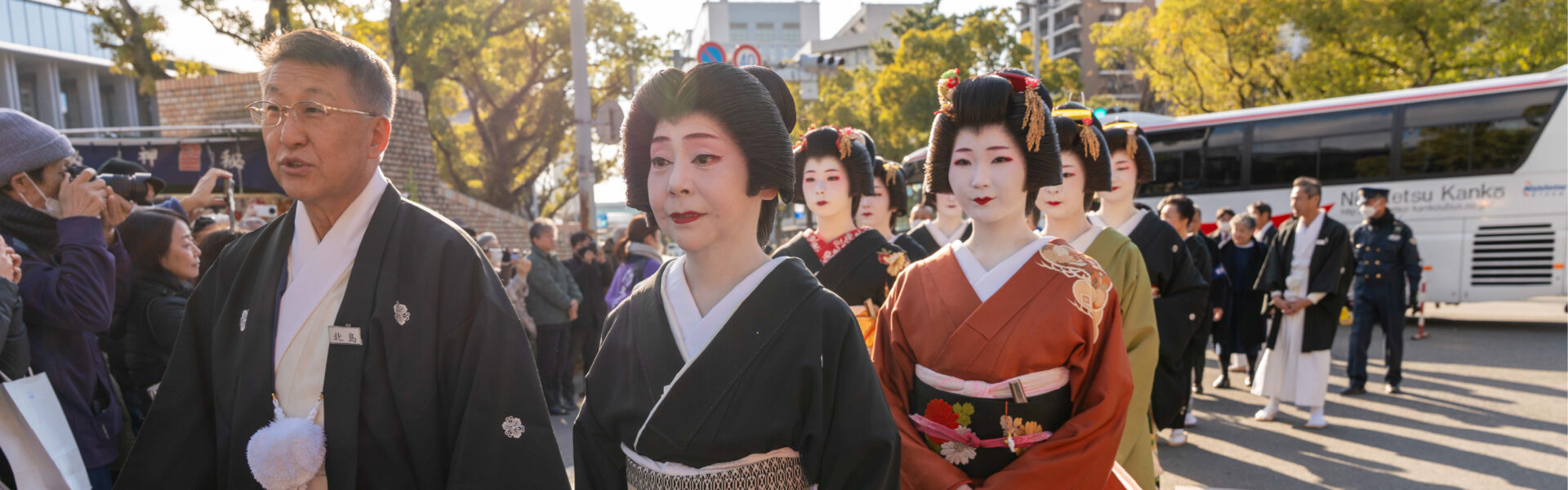 Hakata’s beautiful traditional performing art Hakata Geisha Hakata Kenban. The banquets and tatami rooms are gorgeously colored with songs and dances by geisha.