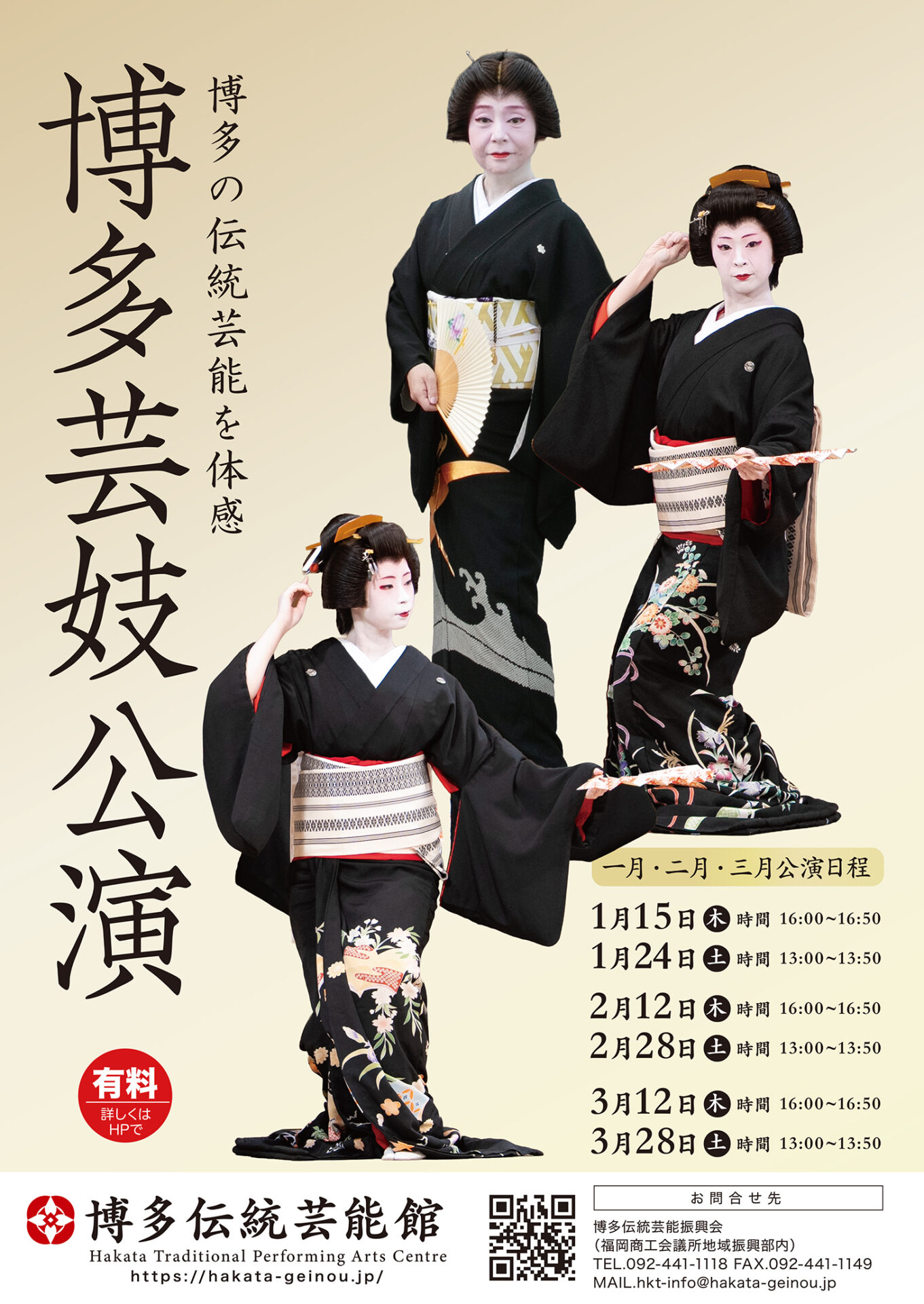 また博多の伝統技芸を身近に感じていただくため、博多の総鎮守・櫛田神社前にある博多伝統芸能館では毎月2回、芸妓による唄や舞を楽しみ、簡単なお座敷遊びを体験していただける公演を行っています。